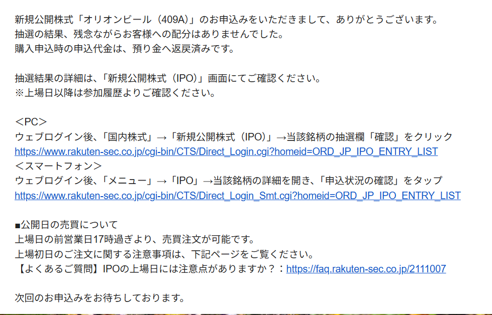 楽しみにしていたオリオンビールIPO,残念ながら楽天証券で申し込みした分も落選してしまいました。