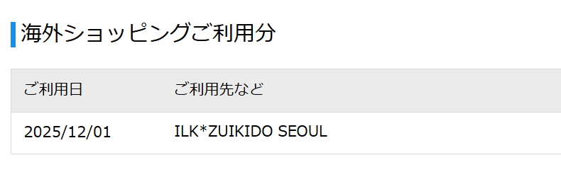 請求明細を確認したところ、「海外ショッピングご利用分」として『ILK*ZUIKIDO SEOUL』というところから請求がありました。