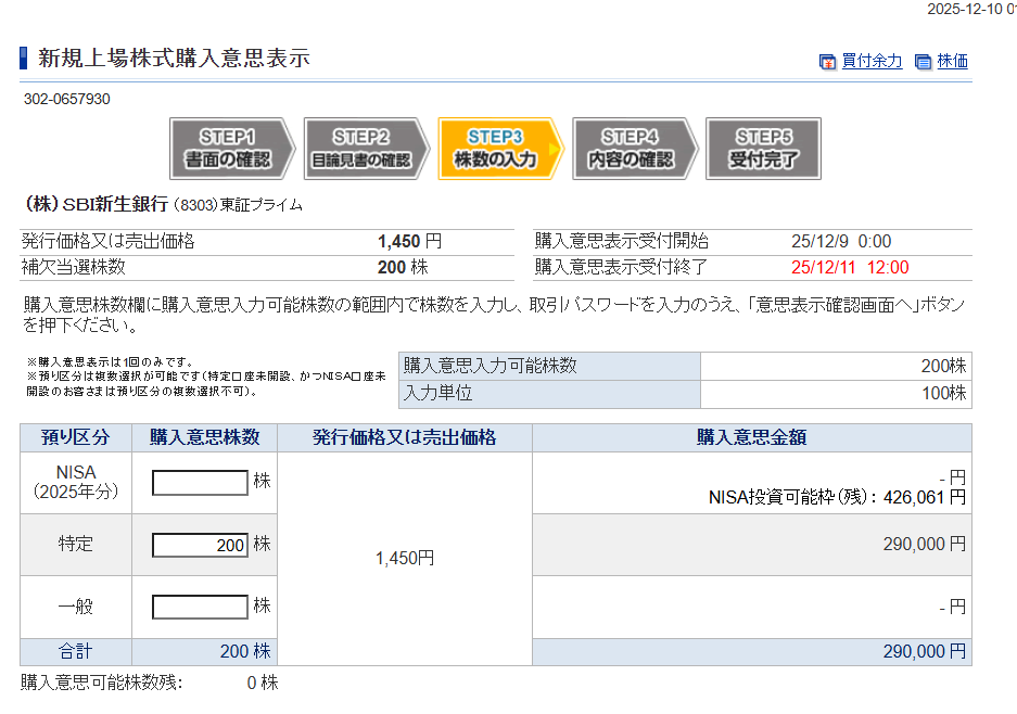 300株で試したところ、「購入意思株数が入力可能株数を超過しております。」というエラーが出ました。